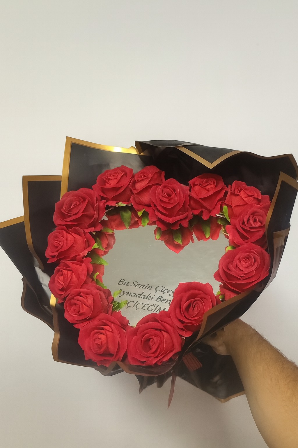 Aynalı kalp şeklinde kırmızı gül aranjmanı, klasik kırmızı güllerin romantizmini, aynanın zarif yansımasıyla buluşturuyor. Aynadaki yazılar ve yansıma, hediyenize farklı bir anlam katıyor ve buketi eşsiz hale getiriyor.