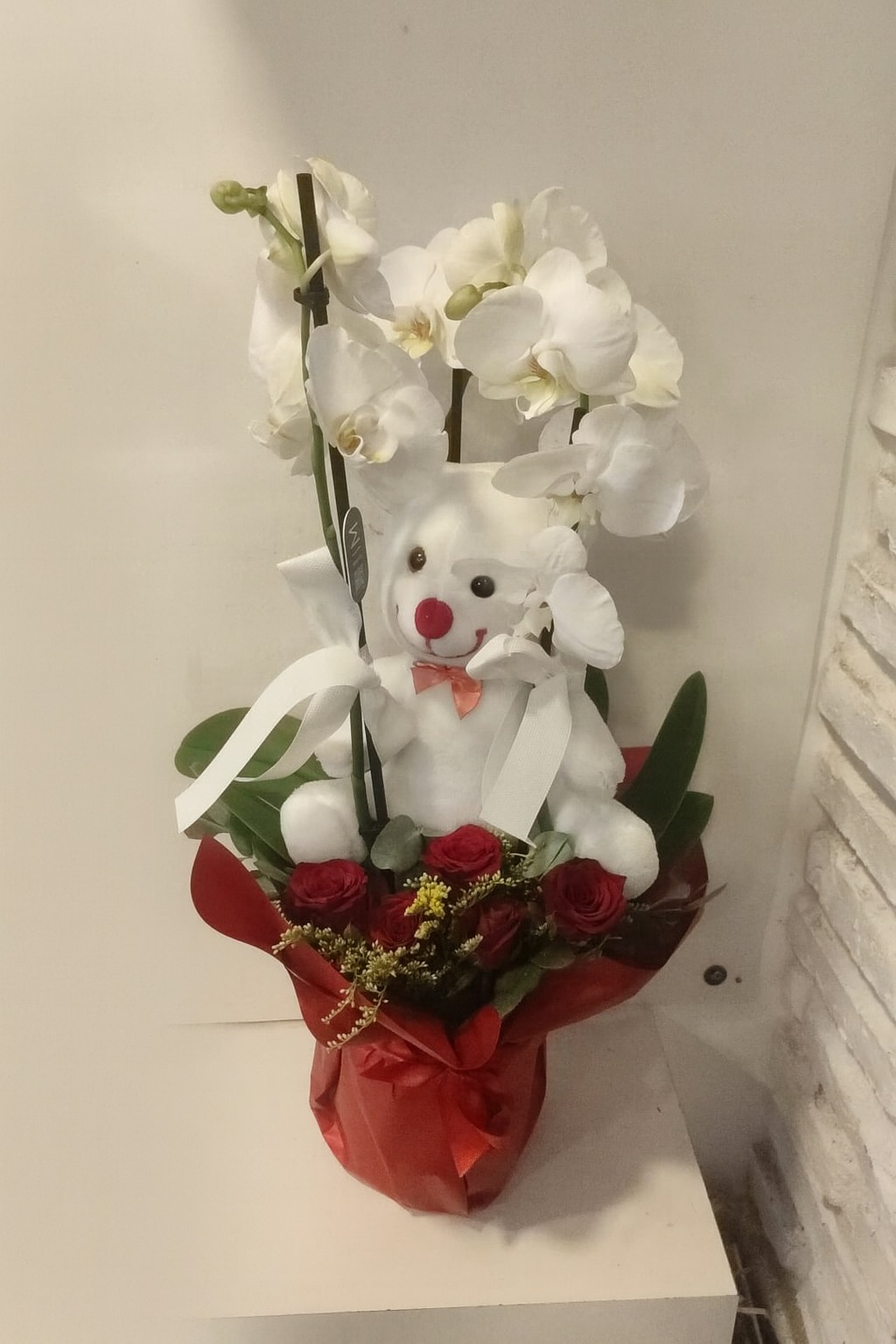 Beyaz Orkide ve Peluş Ayıcık Aranjmanı, şıklığı ve sevimliliği bir arada sunuyor. Saflığı ve masumiyeti simgeleyen beyaz orkide, kırmızı güllerin aşkı ve tutkuyu temsil eden büyüleyici görünümüyle birleşiyor. Aranjmanın tam ortasında yer alan sevimli peluş ayıcık ise bu özel tasarıma farklı bir anlam katıyor.