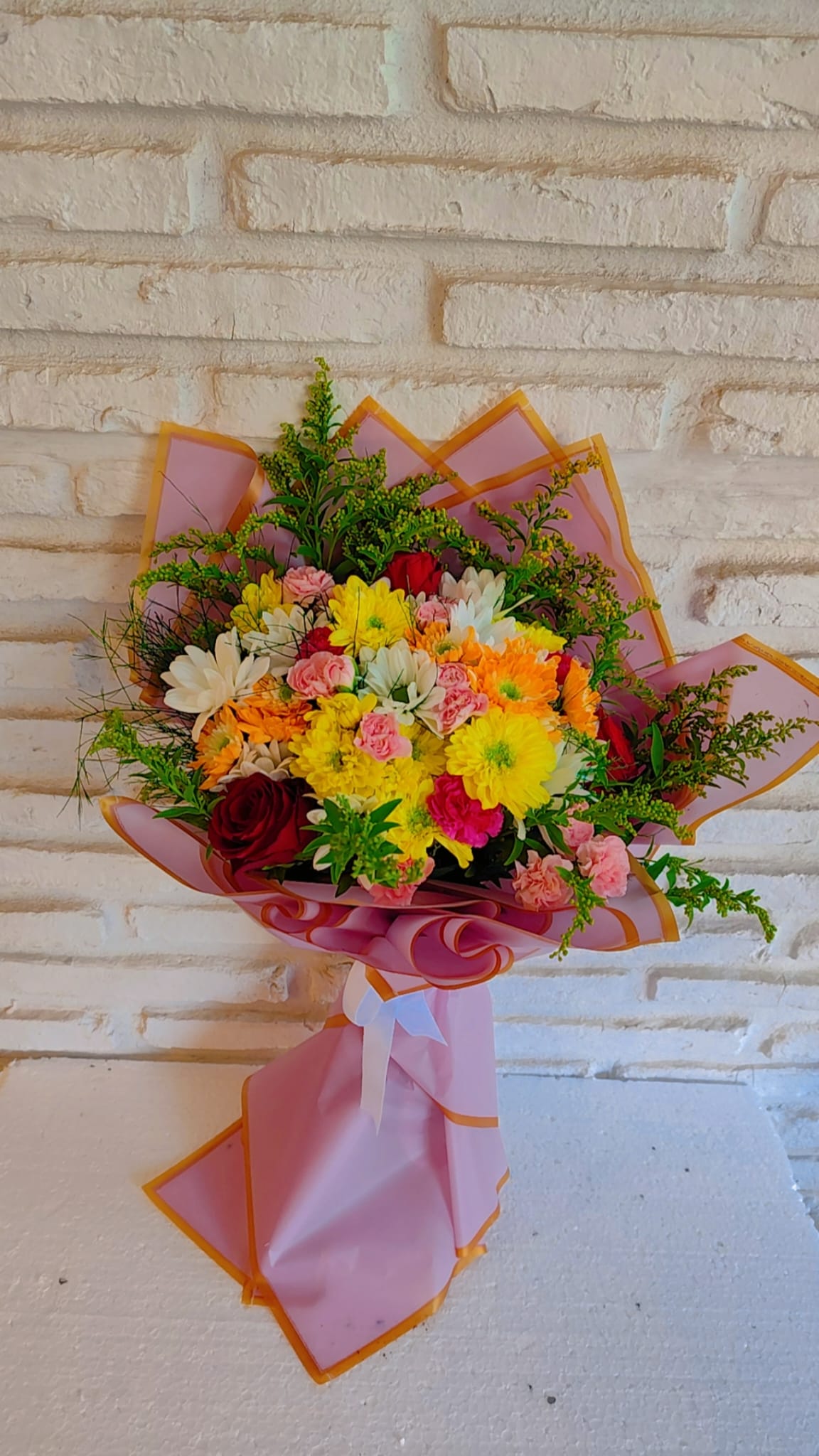 Neşeli Çiçek BuketiMutluluğu ve enerjiyi en güzel şekilde sevdiklerinize hediye edin! Neşeli Çiçek Buketi, kırmızı güllerin tutkulu dokunuşu ile sarı ve pembe karanfillerin canlılığını bir araya getiriyor. Beyaz papatyalar ve yeşil yapraklar, bu renkli çiçek aranjmanını tamamlıyor, görsel bir şıklık yaratıyor.