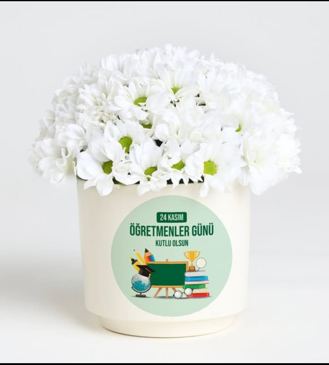 Özel tasarım öğretmen temalı saksıda sunulan bu beyaz papatya aranjmanı, öğretmeninizin masasını ve kalbini güzelleştirecek anlamlı bir hediye seçeneğidir.