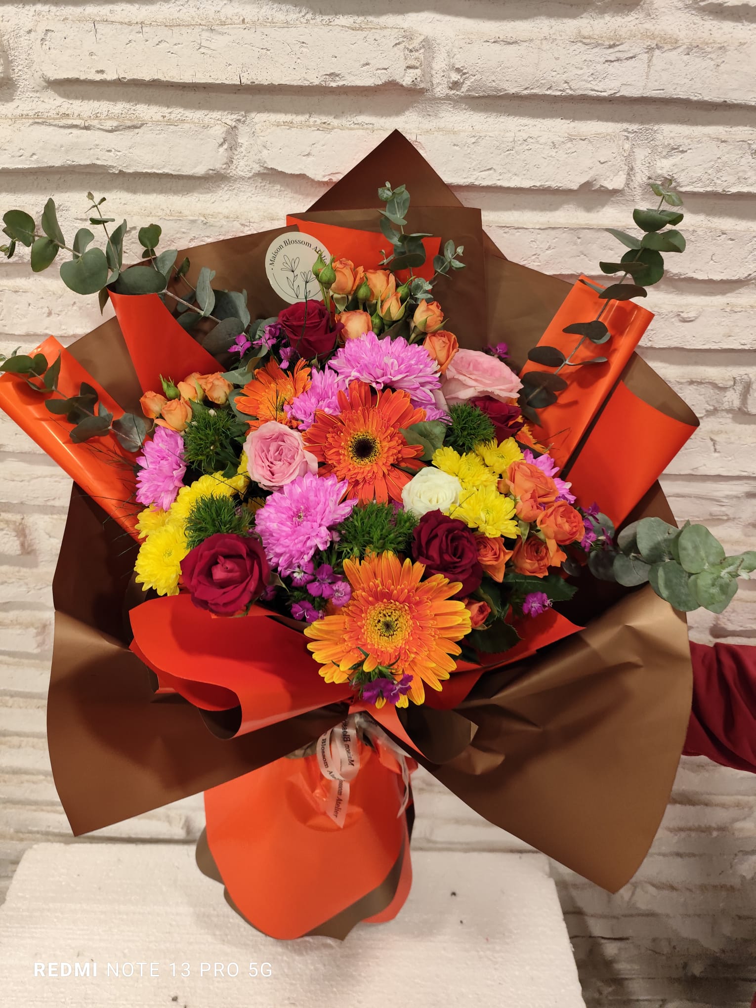 Gerbera, mini güller, kırmızı gül, renkli krizantemler ve okaliptus yapraklarının enerjik buluşmasıyla hazırlanan bu özel renkli karışık çiçek buketi, sevdiklerinize pozitif duygular armağan etmenin en etkili yollarından biridir.