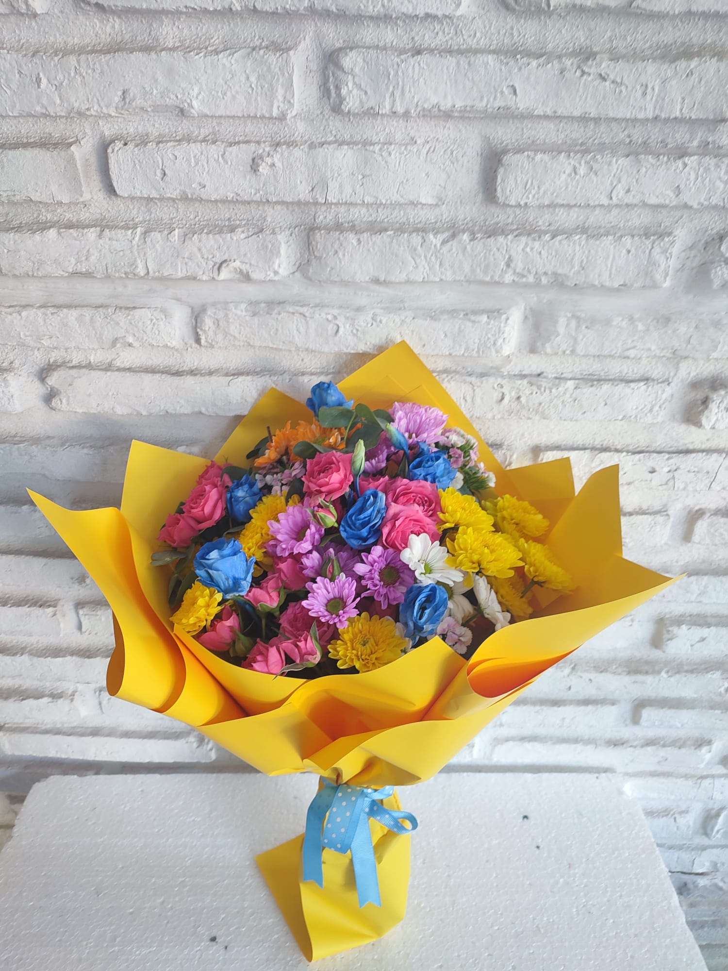 Ambalaj: Sarı konsept hediye buketi + mavi fiyonk detay