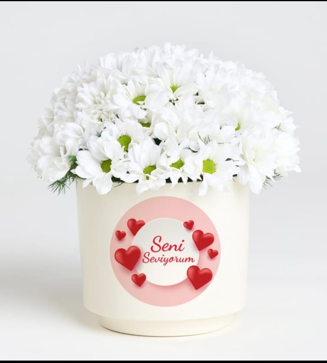 Beyaz papatyaların zarafetiyle hazırlanmış Seni Seviyorum temalı bu özel aranjman, sade ama duygusal bir hediye arayanlar için mükemmel bir seçim.