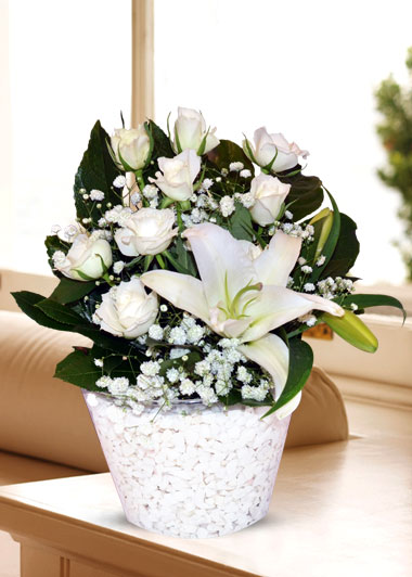 Konik cam vazo içerisinde 9 adet beyaz gül ve 3 kandil beyaz lilyum ile hazırlanmış, çiçek aranjmanı sayesinde sevdiklerinizi mutlu edebilirsiniz. Not:Lilyumlar, mevsim şartları nedeni ile kapalı gönderilebilir. Kapalı lilyumlar oda sıcaklığında 1-2 gün içerisinde açmaktadır.