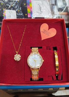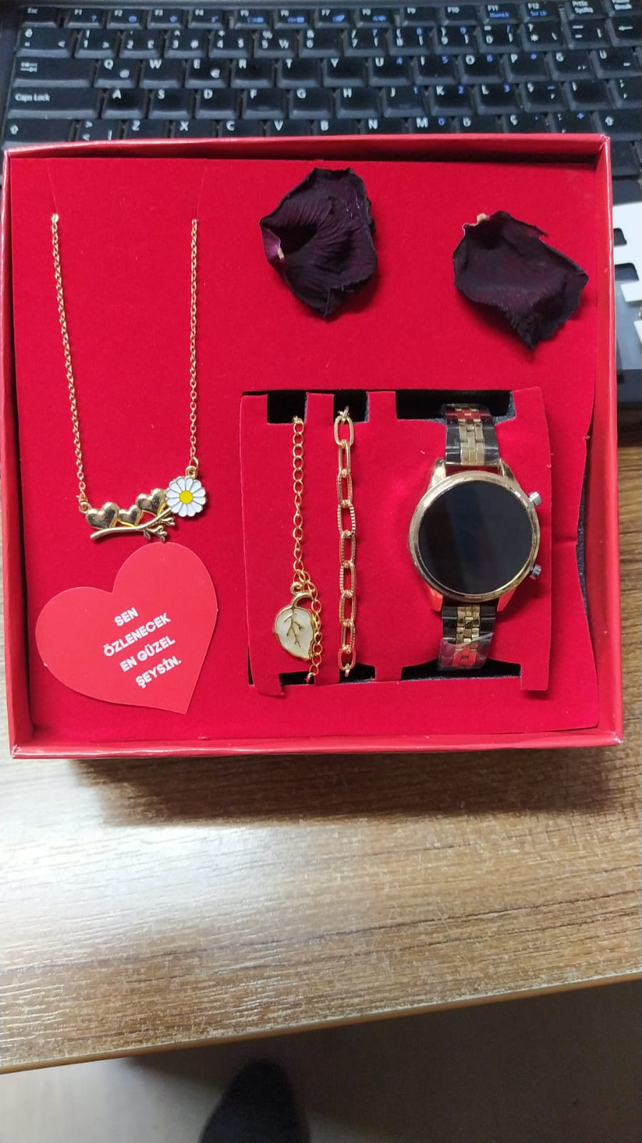 Takı Seti – Kolye, Bileklik ve Şık SaatSevdiğiniz kişiye hem zarif hem de anlamlı bir hediye sunmak istiyorsanız, bu özel takı seti tam size göre. Altın detaylı modern saat, şık bileklik ve papatya süslemeli kolye bir arada romantik bir kutuda sunuluyor.